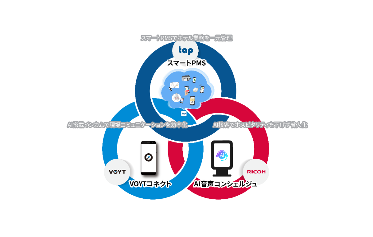 リコージャパンの「RICOH Digital Signage AI音声コンシェルジュ」、タップの観光プラットフォーム基盤「スマート PMS®」、ボイットの「VOYT CONNECT」を